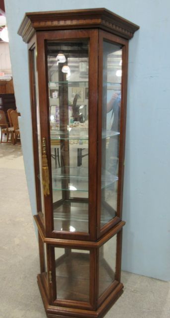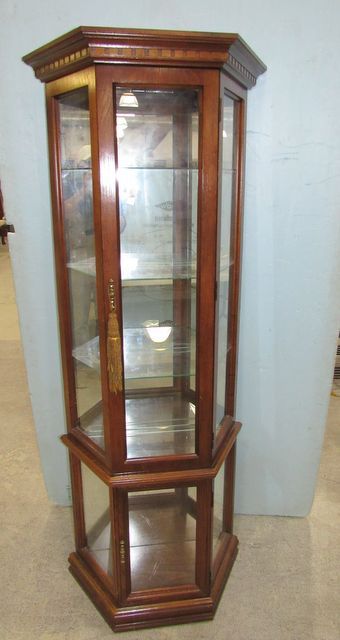 Pressed wood finish with glass shelves, glass side panels, lighted curio, 72"h., 24"w., 12"d. Pressed wood finish with glass shelves, glass side panels, lighted curio, 72"h., 24"w., 12"d.