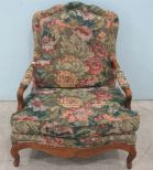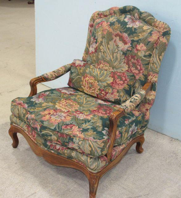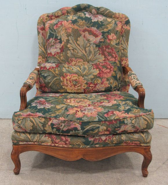 Baker Co. Country French style upholstered arm chair, has wear on armrest, comes with matching pillow, 39"h. Baker Co. Country French style upholstered arm chair, has wear on armrest, comes with matching pillow, 39"h.