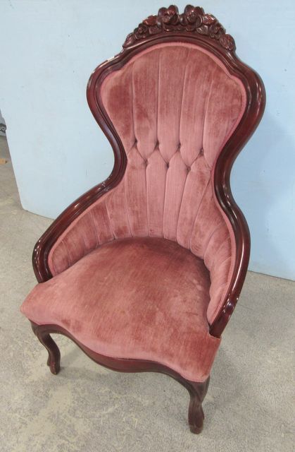Victorian style rose carved ladies arm chair, upholstered, tufted, 44"h. Victorian style rose carved ladies arm chair, upholstered, tufted, 44"h.