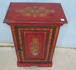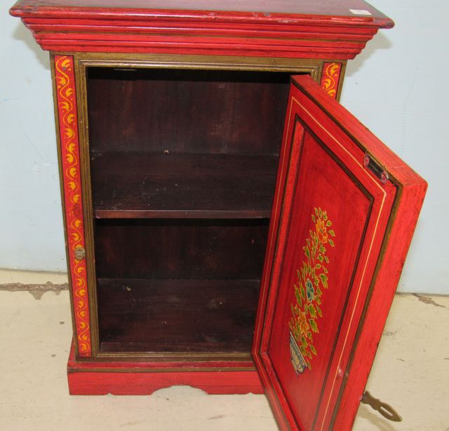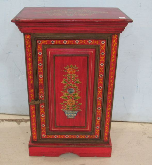 Single door machine painted and made storage cabinet, Made in India, Floral painting border and panels, has painted chips, 30"h., 20"w., 12"d. Single door machine painted and made storage cabinet, Made in India, Floral painting border and panels, has painted chips, 30"h., 20"w., 12"d.