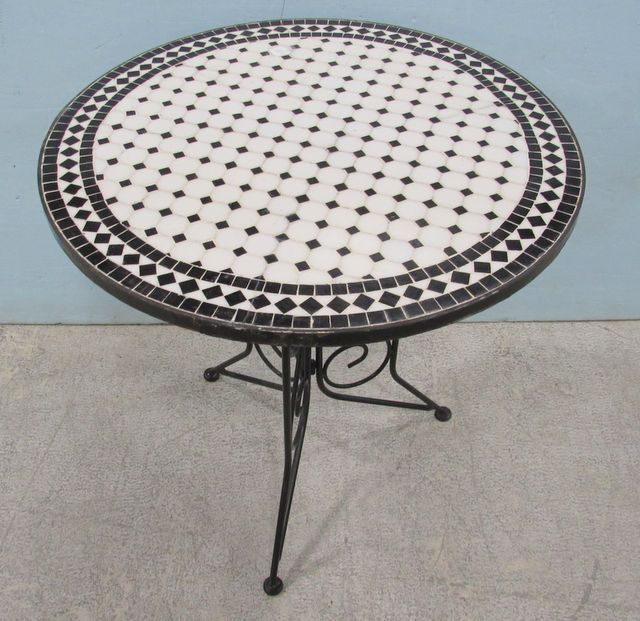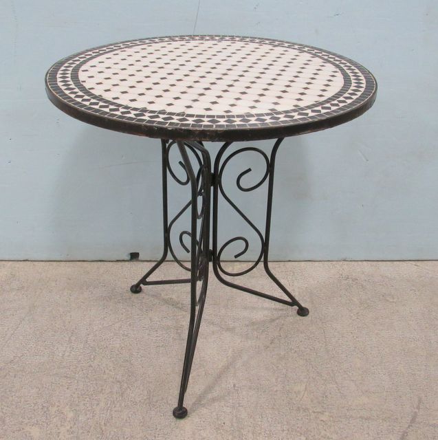 Mosaic round top patio table, top is removable with fold up legs, has painted chipping, 29"h., 27"dia. Mosaic round top patio table, top is removable with fold up legs, has painted chipping, 29"h., 27"dia.