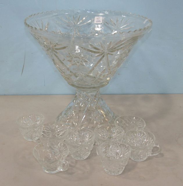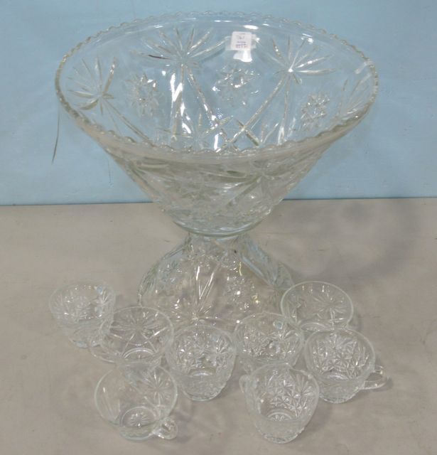 Press glass punch bowl on stand, 13"h., 14"dia., 8 punch cups. Press glass punch bowl on stand, 13"h., 14"dia., 8 punch cups.