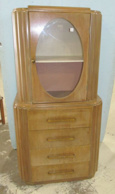 Art Deco single door china cabinet, four drawers, painted finish, oval glass front, painted interior, 64"h., 31"w., 15"d. Art Deco single door china cabinet, four drawers, painted finish, oval glass front, painted interior, 64"h., 31"w., 15"d.