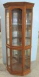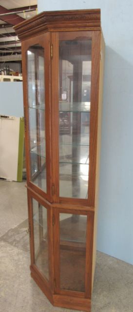 Lighted curio cabinet, double glass doors, glass side panels, mirrored back, small crack bottom left mirror corner, glass shelves, 74"h., 31"w., 11"d. Lighted curio cabinet, double glass doors, glass side panels, mirrored back, small crack bottom left mirror corner, glass shelves, 74"h., 31"w., 11"d.
