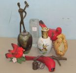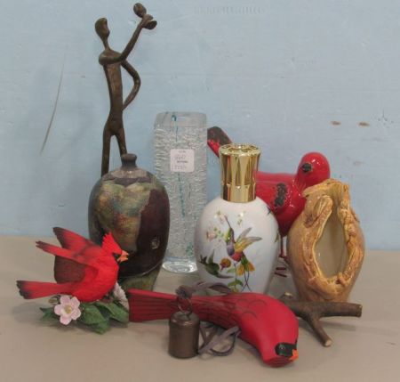 Hand made unique pottery vase by Carol 5"h., Limoge porcelain bird painted incense burner, Lenox porcelain Cardinal, Red glazed pottery bird 6"h., signed pottery vase 6"h., hand made metal man figure 11"h., Jingle Bird, bubble glass flute. Hand made unique pottery vase by Carol 5"h., Limoge porcelain bird painted incense burner, Lenox porcelain Cardinal, Red glazed pottery bird 6"h., signed pottery vase 6"h., hand made metal man figure 11"h., Jingle Bird, bubble glass flute.