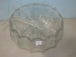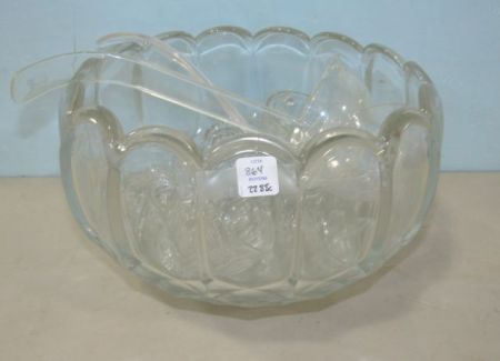 Vintage glass punch bowl 8"h., 12"dia., 12 punch cups and two plastic ladles. Vintage glass punch bowl 8"h., 12"dia., 12 punch cups and two plastic ladles.