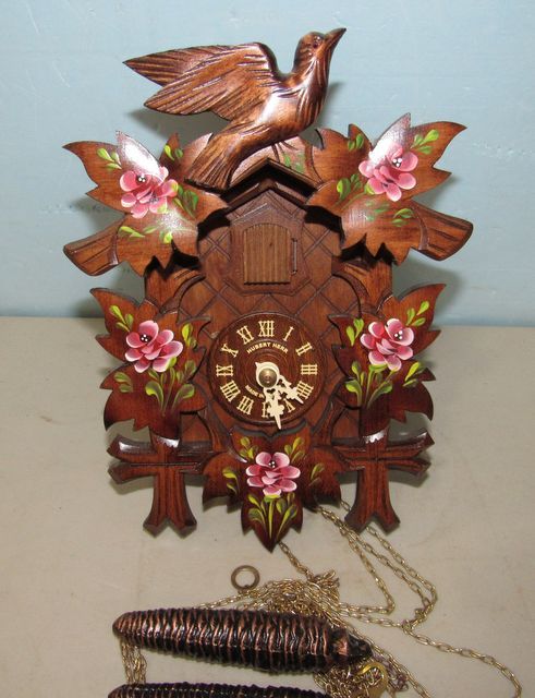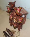 Hand made and painted German Cuckoo clock, has weights but no pendulum, 10"h., 7"w. Hand made and painted German Cuckoo clock, has weights but no pendulum, 10"h., 7"w.