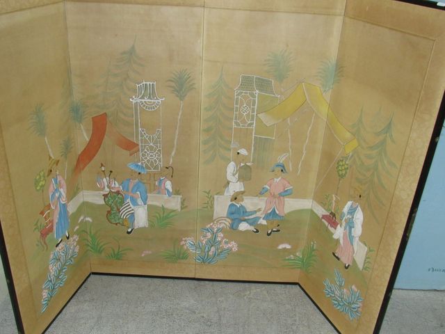 Dressing screen, four panels, Japanese people depicted in the imagery, hand painted on paper, has some wear, brass ormolu, 48"h., 18" each panel. Dressing screen, four panels, Japanese people depicted in the imagery, hand painted on paper, has some wear, brass ormolu, 48"h., 18" each panel.