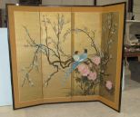 Dressing screen, four panels, hand painted birds on paper, has some bad storks, brass ormolu, each panel is 60"h., 18"w. Dressing screen, four panels, hand painted birds on paper, has some bad storks, brass ormolu, each panel is 60"h., 18"w.