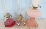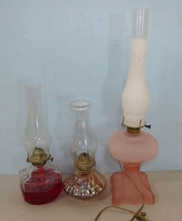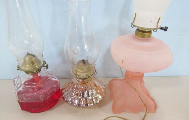 Pressed glass oil lamp with hurricane shade 16"h., Carnival style oil lamp with hurricane shade 14"h., Frosted electrified oil lamp 24"h. Pressed glass oil lamp with hurricane shade 16"h., Carnival style oil lamp with hurricane shade 14"h., Frosted electrified oil lamp 24"h.