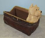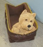 Resin decor dog and suitcase storage bin, has some chips on finish, 15"h., 20"w., 12"d. Resin decor dog and suitcase storage bin, has some chips on finish, 15"h., 20"w., 12"d.