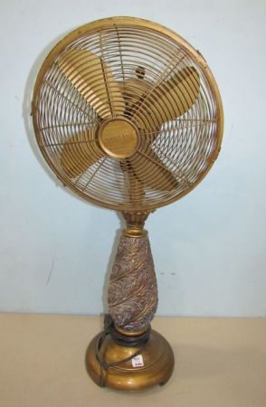 Modern resin base and ornate resin floral rod, painted brass color fan, 22"h. Modern resin base and ornate resin floral rod, painted brass color fan, 22"h.