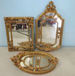 Three modern gold framed square mirror and two oval mirrors, 20"h. Three modern gold framed square mirror and two oval mirrors, 20"h.