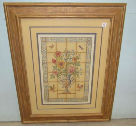 Framed, matted, print of tile style flowers in urn, 32"h., 26"w. Framed, matted, print of tile style flowers in urn, 32"h., 26"w.