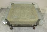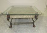 Modern decor coffee table with metal frame paw feet and center medallion, beveled glass top, 18"h., 38"sq. Modern decor coffee table with metal frame paw feet and center medallion, beveled glass top, 18"h., 38"sq.