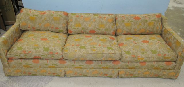 Three cushion sofa with yellow, beige, floral pattern, 8'ft L., 24"h. Three cushion sofa with yellow, beige, floral pattern, 8'ft L., 24"h.