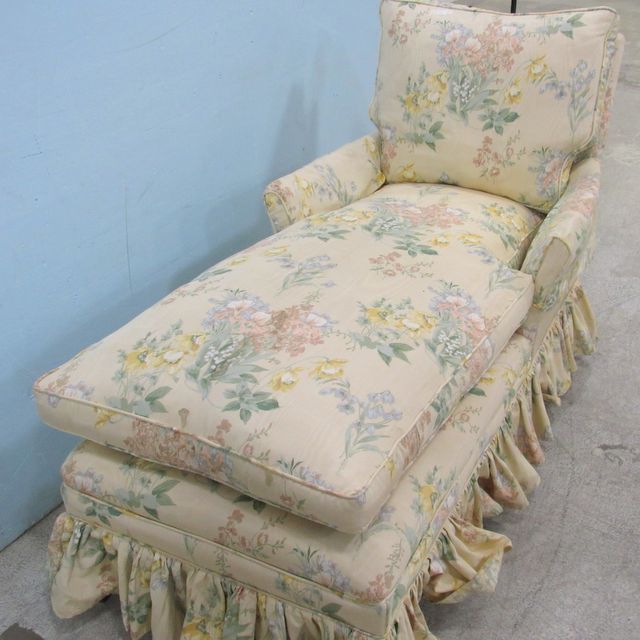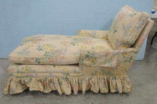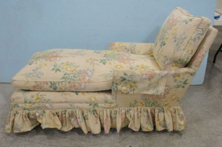 Contemporary chaise lounge, is skirted, has a few stains, 33"h., 54"L. Contemporary chaise lounge, is skirted, has a few stains, 33"h., 54"L.