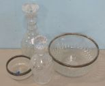 E.B Rogers silverplate rim pressed glass bowl 2"h. 5"dia., France silverplate rim pressed glass bowl 4"h., 9"dia. Clear glass decanter 12"h., pressed glass decanter 9"h. E.B Rogers silverplate rim pressed glass bowl 2"h. 5"dia., France silverplate rim pressed glass bowl 4"h., 9"dia. Clear glass decanter 12"h., pressed glass decanter 9"h.