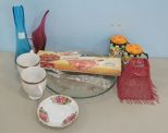Silver plate rim charger, frosted glass plate, blue art glass vase, red art glass vase, red beaded lamp shade, hand painted salt & pepper by Vicki, Mikasa china cups, English Garden saucer. Silver plate rim charger, frosted glass plate, blue art glass vase, red art glass vase, red beaded lamp shade, hand painted salt & pepper by Vicki, Mikasa china cups, English Garden saucer.