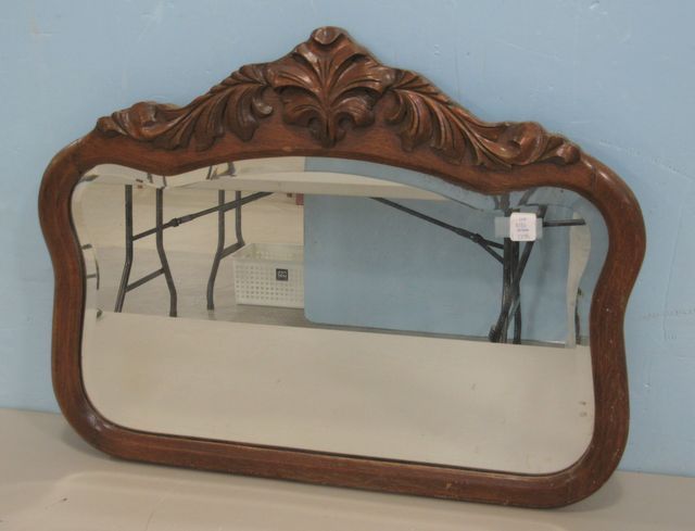 Carved leaf crest, beveled mirror, has wear, 20"h., 26"w. Carved leaf crest, beveled mirror, has wear, 20"h., 26"w.