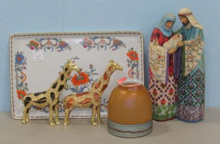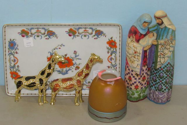 Jim Shore Mary and Jopesh, Stenben Night Cover (has signed marks), two ornate Giraffe trinket boxes, Raynaud Limoges platter 13"w. Jim Shore Mary and Jopesh, Stenben Night Cover (has signed marks), two ornate Giraffe trinket boxes, Raynaud Limoges platter 13"w.