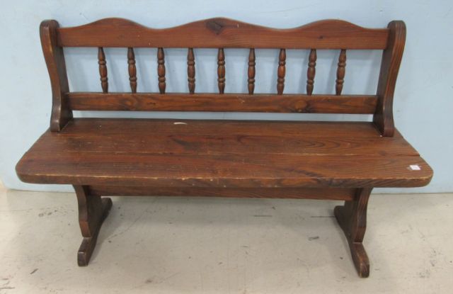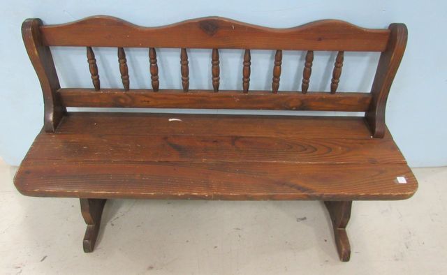 Spindle back design, double leg with stretcher, has finish worn spots on wood, 34"h., 54"w., 17"d. Spindle back design, double leg with stretcher, has finish worn spots on wood, 34"h., 54"w., 17"d.