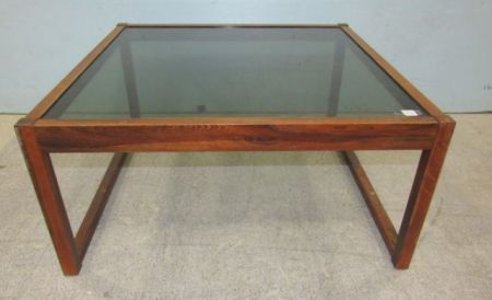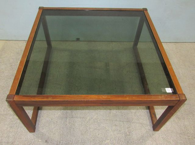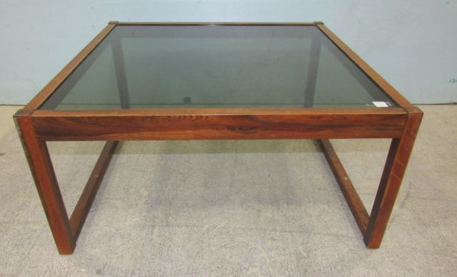 Made in Denmark, burl wood with tinted glass inset, 15"h., 32"sq. Made in Denmark, burl wood with tinted glass inset, 15"h., 32"sq.