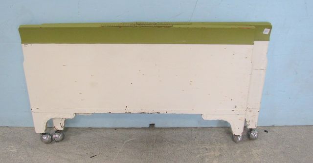 Painted twin bed green and white, on wheel, has wood rails. Painted twin bed green and white, on wheel, has wood rails.