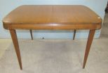 Maple dining table, one leaf, four bolt on legs, has wear and veneer missing, 30"h., 47"w., 32"d. Maple dining table, one leaf, four bolt on legs, has wear and veneer missing, 30"h., 47"w., 32"d.
