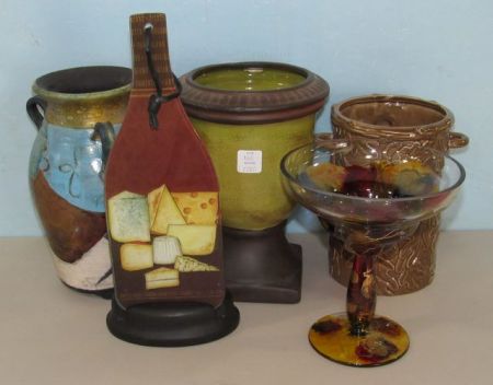 Modern age crackling urn 10"h., hand painted jug signed (has damaged rim), hand painted glass stem, Asheville Mug Pie Jar 8"h., glass decor wine on stand. Modern age crackling urn 10"h., hand painted jug signed (has damaged rim), hand painted glass stem, Asheville Mug Pie Jar 8"h., glass decor wine on stand.