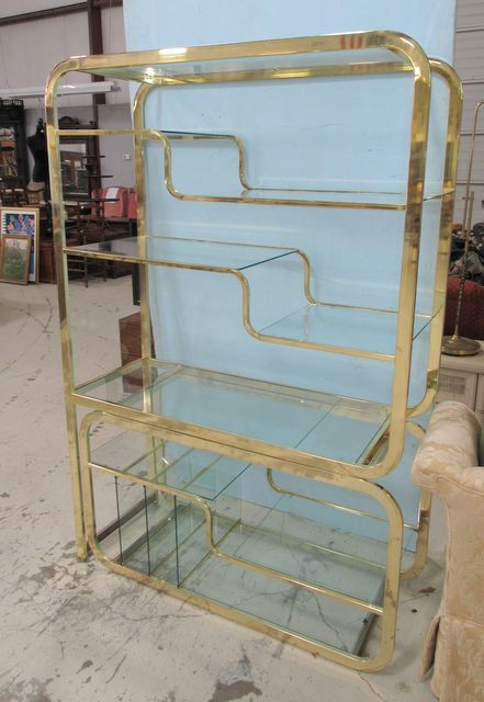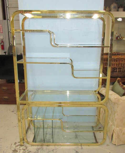 Two piece brass display shelf with glass shelves. Two piece brass display shelf with glass shelves.