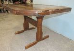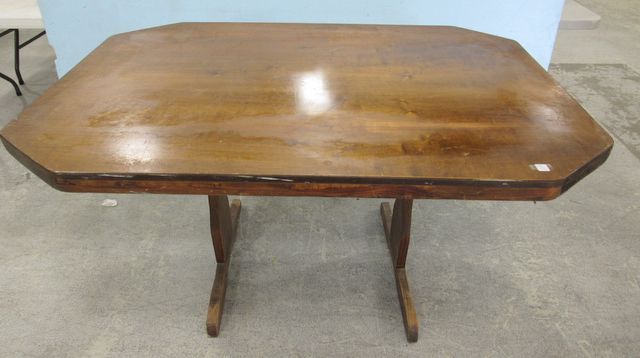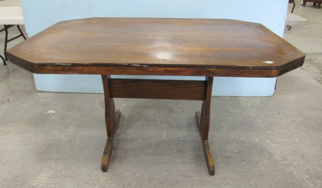 Hand made double pedestal kitchen table, needs work, two feet have chew marks, needs tightening, 31"h., 60"w, 42"d. Hand made double pedestal kitchen table, needs work, two feet have chew marks, needs tightening, 31"h., 60"w, 42"d.