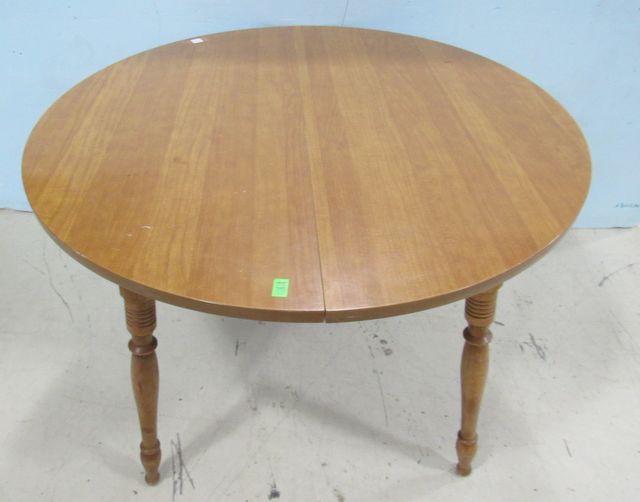 Rockport round maple laminate top kitchen table, has wear, one leaf, 29"h., 40"dia. Rockport round maple laminate top kitchen table, has wear, one leaf, 29"h., 40"dia.