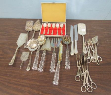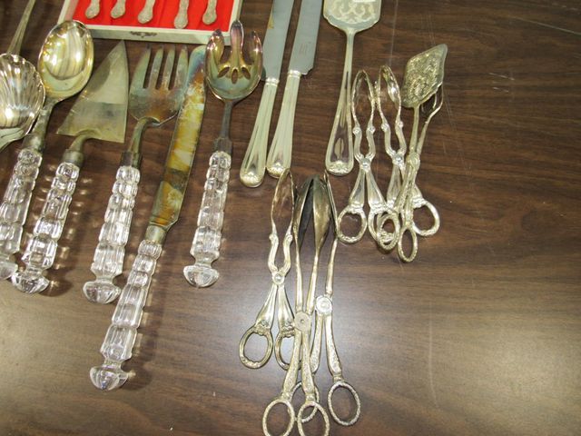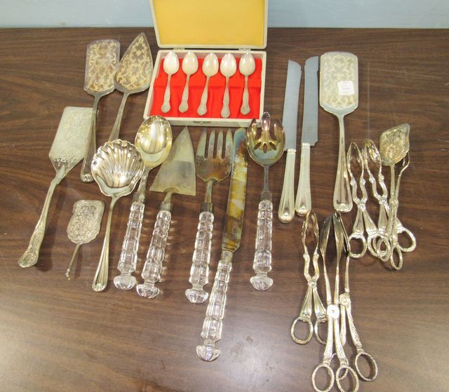 Silverplate tongs, carving sets, Gorham, cake servers. Silverplate tongs, carving sets, Gorham, cake servers.