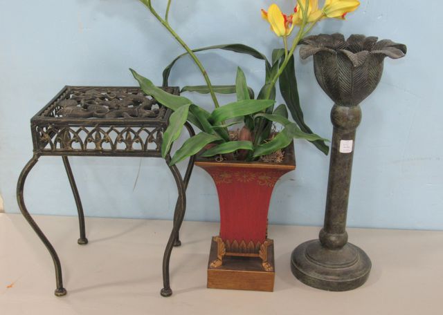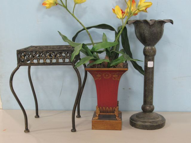 Distressed metal stand 14"h., 9"w., Red urn planter 11"h., metal leaf candle holder 19"h. Distressed metal stand 14"h., 9"w., Red urn planter 11"h., metal leaf candle holder 19"h.