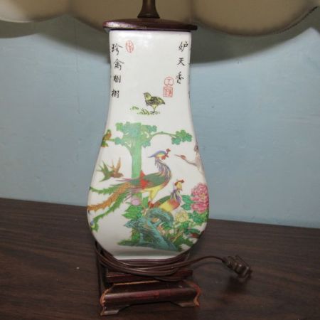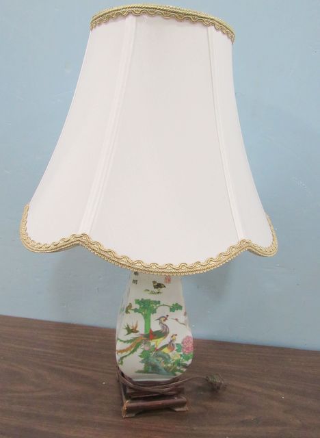 Wood base stand, bird design, has shade, missing top finial. 23"h. Wood base stand, bird design, has shade, missing top finial. 23"h.