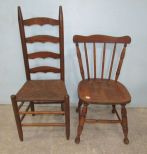 Vintage ladder back woven seat chair 42"h., Spindle back chair (back is loose) 33"h. Vintage ladder back woven seat chair 42"h., Spindle back chair (back is loose) 33"h.
