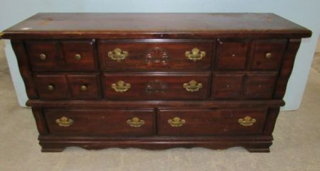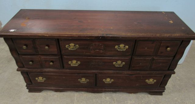 Condition issues, 8 drawers, missing three knobs, scratches and worn areas, 32"h., 62"w., 18"d. Condition issues, 8 drawers, missing three knobs, scratches and worn areas, 32"h., 62"w., 18"d.