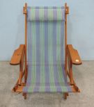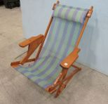 Fold out wood lounge chair, blue nylon seat and head cushion. Fold out wood lounge chair, blue nylon seat and head cushion.