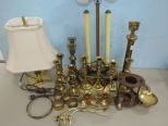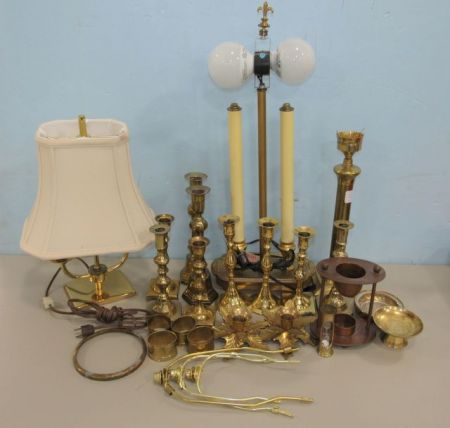 14 assorted sized brass candle holders, brass two arm table lamp with shade 15"h., ornate base table lamp no shade, four brass napkin rings, and brass shade rods. 14 assorted sized brass candle holders, brass two arm table lamp with shade 15"h., ornate base table lamp no shade, four brass napkin rings, and brass shade rods.