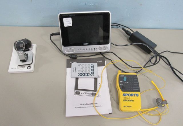 Coby 5.6" TFT LCD portable flatscreen televison with remote, Motorola Universal Bluetooth Headset 12, Sports FM/AM Walkman. Coby 5.6" TFT LCD portable flatscreen televison with remote, Motorola Universal Bluetooth Headset 12, Sports FM/AM Walkman.