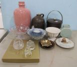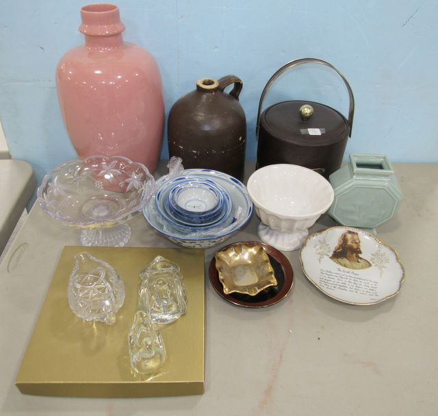 Large Pink ceramic vase (has small chip) 17"h., Vintage brown crock jug has wear, ice bucket, Chinese blue and white bowls, flower glass compote, collectible plate, white ceramic compote. Large Pink ceramic vase (has small chip) 17"h., Vintage brown crock jug has wear, ice bucket, Chinese blue and white bowls, flower glass compote, collectible plate, white ceramic compote.