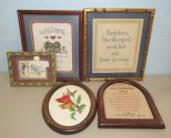 Framed Robin needlepoint, Southerner, Bachelors sampler, Welcome, Thou Shalt print. Framed Robin needlepoint, Southerner, Bachelors sampler, Welcome, Thou Shalt print.