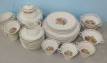 Eight dinner plates, six salad plates, ten saucers, eight cups, eleven soup saucers, four soup bowls, creamer and sugar. Eight dinner plates, six salad plates, ten saucers, eight cups, eleven soup saucers, four soup bowls, creamer and sugar.