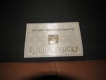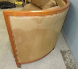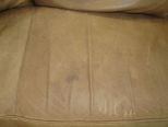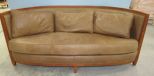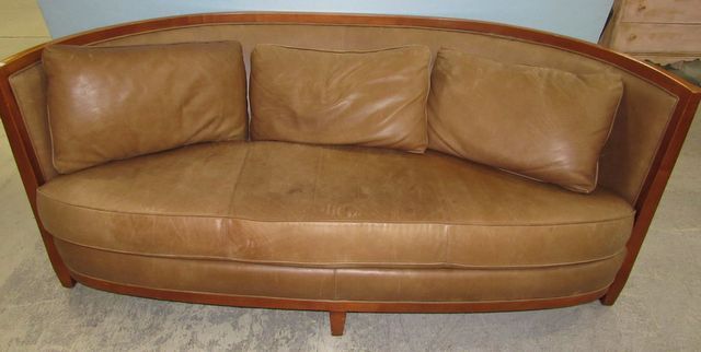 Wood trim, one section leather cushion, three leather back cushions, leather has wear and light areas, has loose border trim in spots, 34"h., 82"w., 29"d. Wood trim, one section leather cushion, three leather back cushions, leather has wear and light areas, has loose border trim in spots, 34"h., 82"w., 29"d.