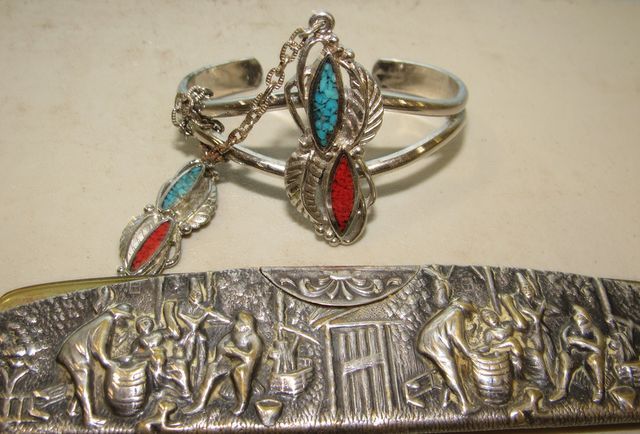 375 Circa 1900's Fancy Metal Edge Cover Comb and Silver tone Slave Bracelet