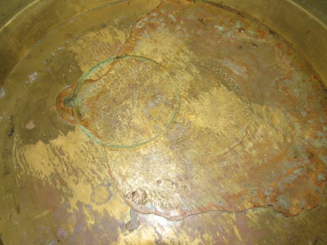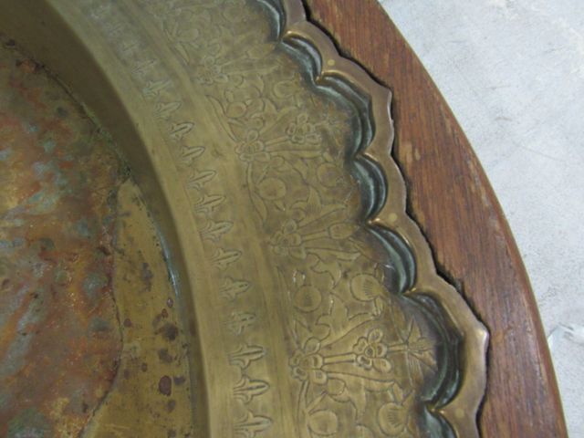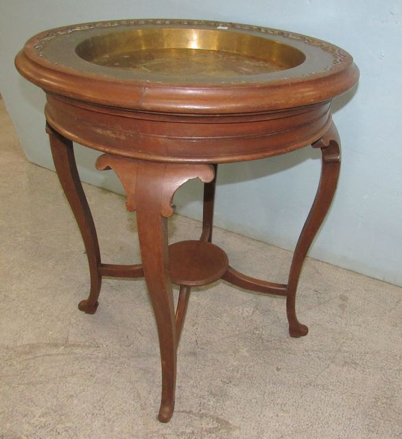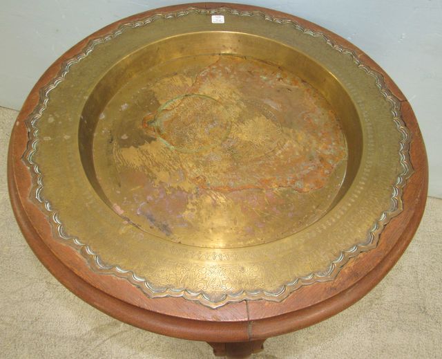 Ornate brass top inset, brass has worn spots, two tier stand, 30"h., 26"dia. Ornate brass top inset, brass has worn spots, two tier stand, 30"h., 26"dia.