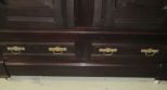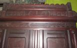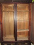 Carved, crest, two drawers, two door, has shelves, clothes rack, has some finish wear, porcelain wheels, bought in New Orleans, 8'6 tall, 53"w. Carved, crest, two drawers, two door, has shelves, clothes rack, has some finish wear, porcelain wheels, bought in New Orleans, 8'6 tall, 53"w.