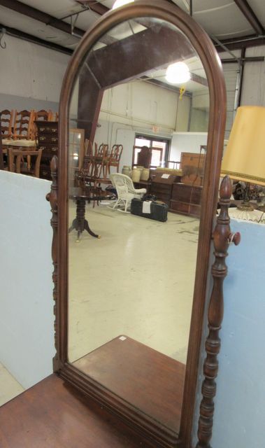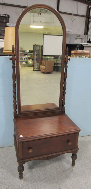 Bonnet dressing mirror with one drawer storage cabinet, 69"h., 27"w., 18"d. Bonnet dressing mirror with one drawer storage cabinet, 69"h., 27"w., 18"d.