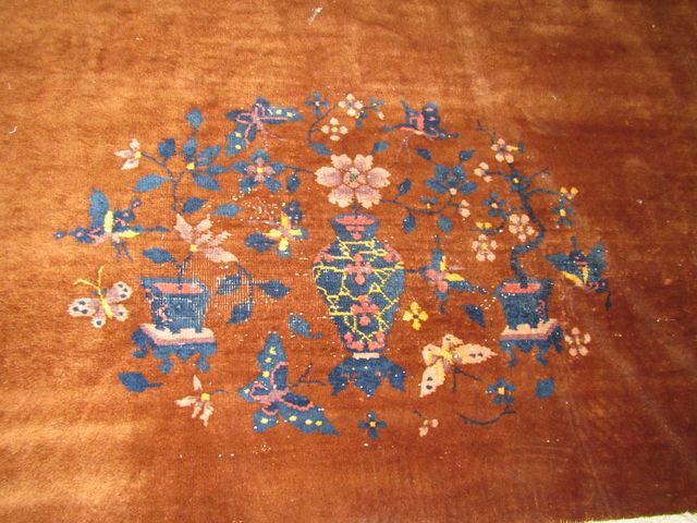 100 % wool, handmade burnt orange, vase and floral pattern design, 5'11 x 8'7. 100 % wool, handmade burnt orange, vase and floral pattern design, 5'11 x 8'7.